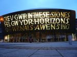 Moving a bit more laterally … the new Wales Millennium Centre has lines by the Welsh poet, Gwenyth Lewis, in (literally) six foot high stained glass letters around the outside: