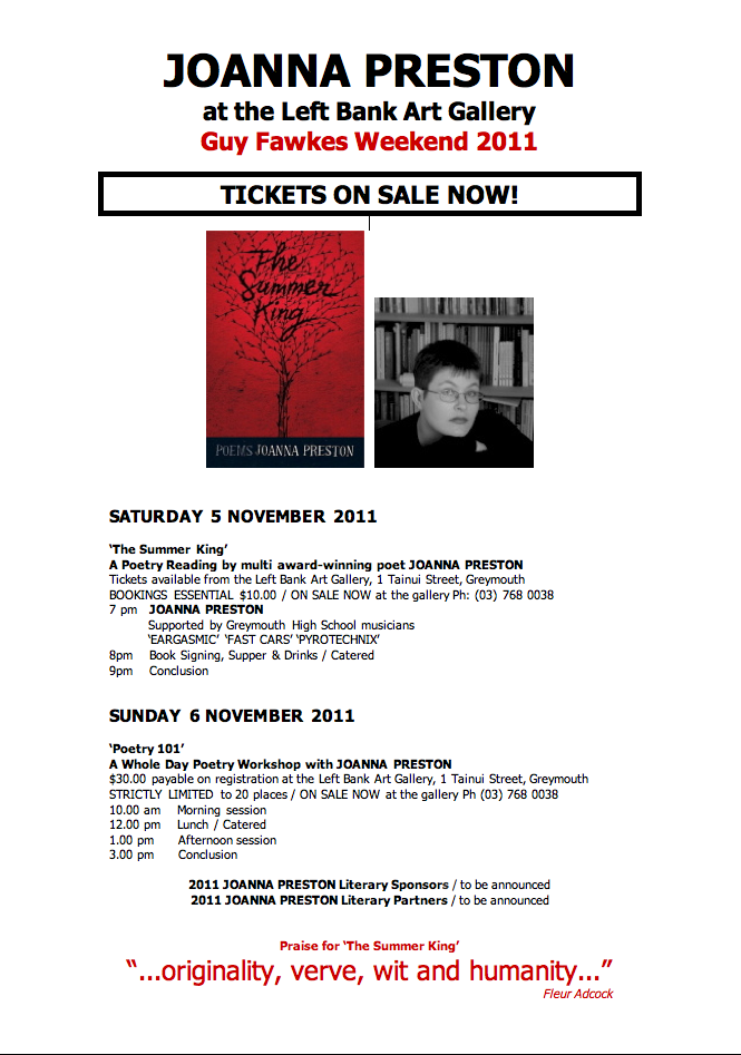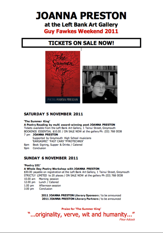 For those of you on the West Coast, or anyone who fancies the idea of a weekend immersed in poetry, the planning for Guy Fawkes Weekend in Greymouth has come together with the sort of efficiency not seen since the Opening Ceremony of the Beijing Olympics. Details are below and in the sidebar, or click on this link for a printable poster of your own.