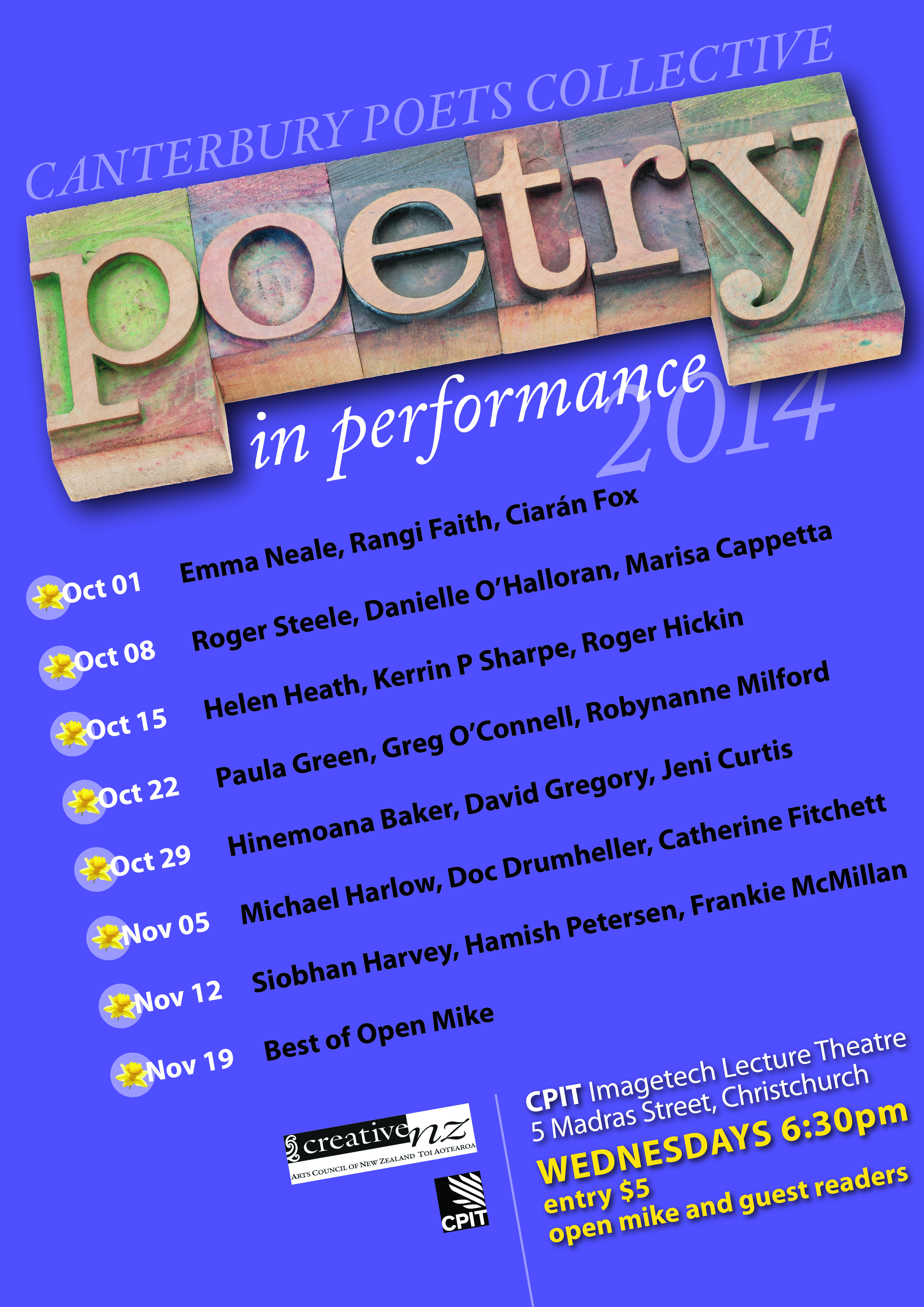 Spring has sprung, the daffodils are dandy, the lambs are leaping and the birds are … um, randy. (Well, they are here at any rate.) Which means it’s time to dust off your poetry-shoes and practice your readings, because the annual Canterbury Poets Collective Poetry in Performance series is upon us once more! (Clicking here will open a downloadable version of the poster, for you to keep for your very own.)