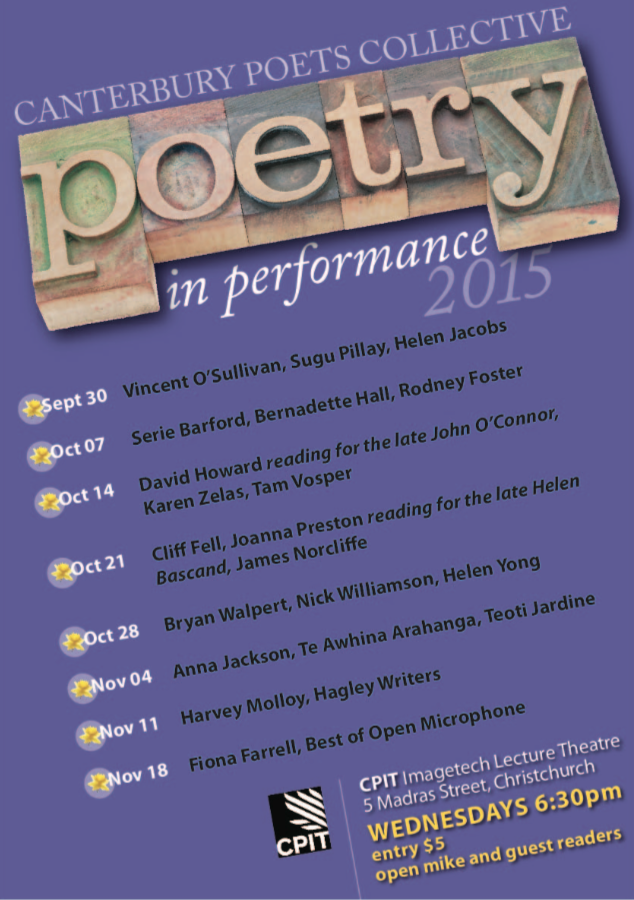 As you can see, there are two special readings. On October 14th, David Howard will be reading a selection of poems by the late John O’Connor, and the following week will be my turn to read poems by Helen Bascand. I think it’s a lovely gesture that the CPC have made, asking us to read for these two much-missed stalwarts of the Canterbury poetry scene. Both will be quite moving events.