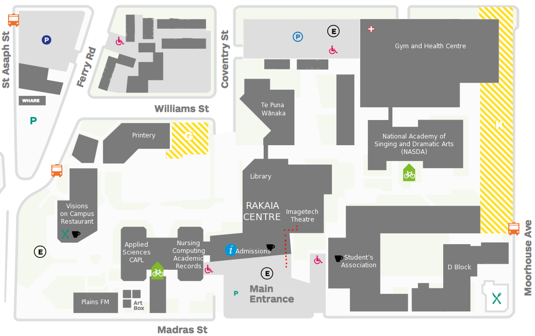 - Go through the main doors, into the Rakaia Centre. (Big building.)