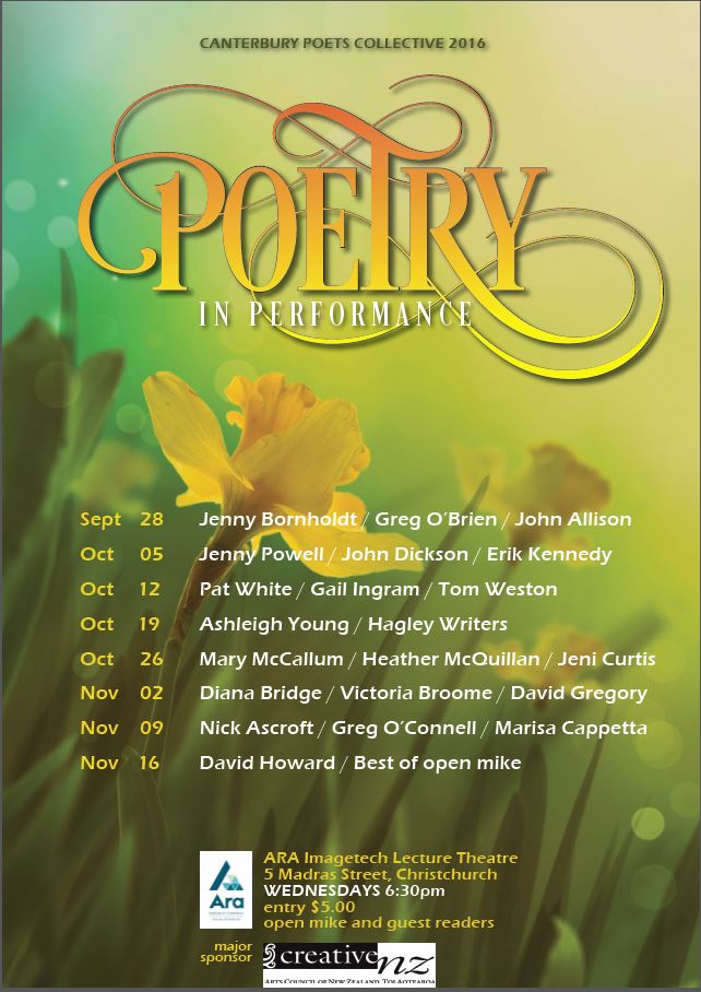 Yes indeed, it is that time of year. Once again the Canterbury Poets’ Collective have assembled a selection of the great and the good of New Zealand poetry for the entertainment of the Canterbury public, and for eight weeks starting from the end of September, your Wednesday nights will be fully occupied. (Well, two hours of them, plus whatever your travel time happens to be.)
