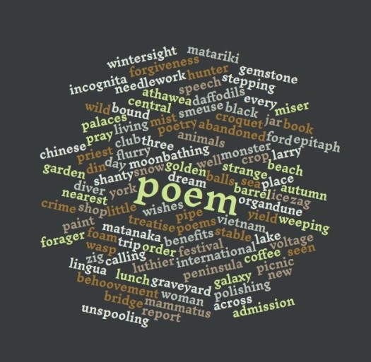 This is the final word cloud from shortlisted books – coming to you from Sue Wootton’s The Yield. Marvel at the cloud itself, and contemplate what stunning titles the are. (I really need a kilo or two of whatever these five poets are on, to help with my own titles …) And just in case you’re wondering, the poems are pretty damn fine too. Which is a tremendous surprise, what with this being Sue Wootton.*