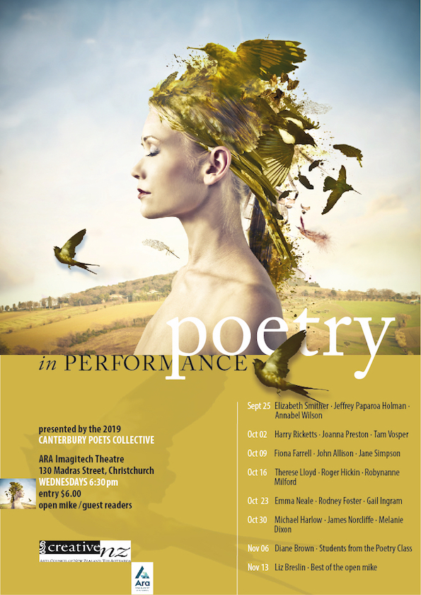 I know winter feels as though it will never depart, but it will. There are buds just starting to colour on my plum trees, the blackbirds are fighting for territory, and every time I turn around there seems to be another flourish of jonquils. But even more certainly a harbinger of spring-to-come, it is now time to pimp The 2019 Canterbury Poets’ Collective Poetry in Performance readings!