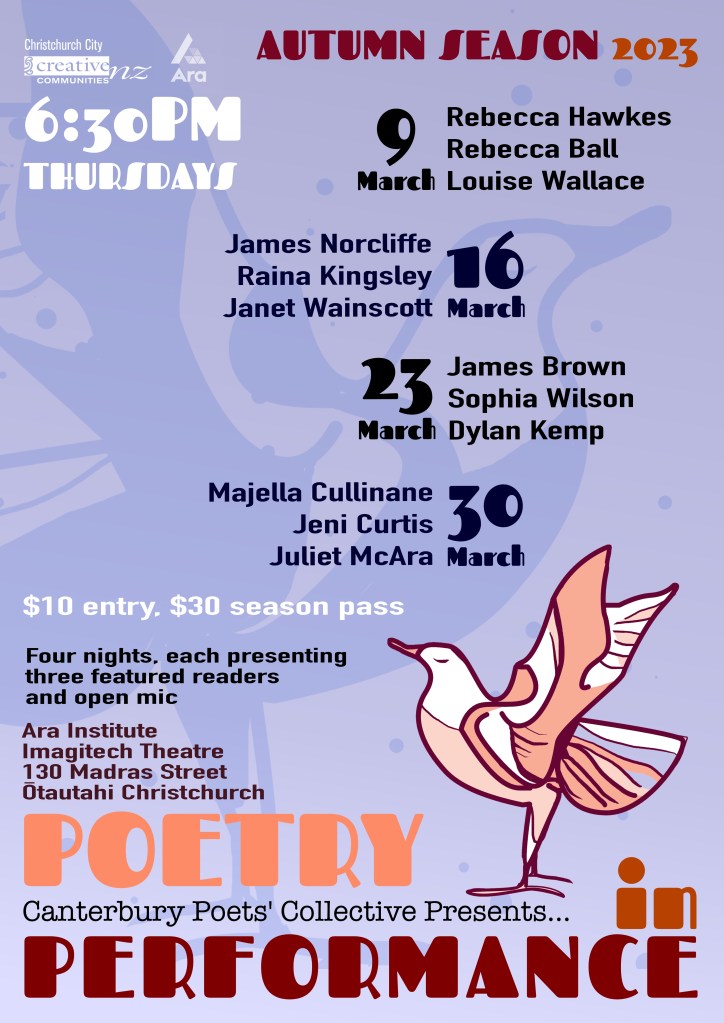 Posted on 13 March 2023 by JopreCPC Poetry in Performance – Autumn 2023 edition For More information, visit https://canterburypoets.org.nz/tickets/ Share this: Click to share on Reddit (Opens in new window) Reddit Click to share on X (Opens in new window) X Click to share on Pinterest (Opens in new window) Pinterest Click to share on Tumblr (Opens in new window) Tumblr Like Loading... Related